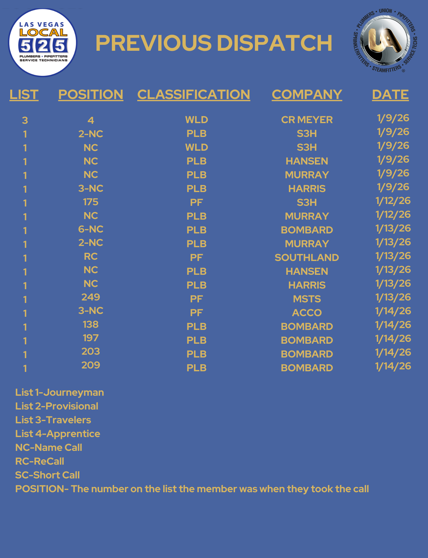 The dispatch call in phone is (702) 626-0817 – when you call this number you will be connected to Google Voice and asked to leave a message. PLEASE LEAVE A CLEAR MESSAGE STATING AND SPELLING YOUR FIRST AND LAST NAME. THE NUMBER YOU CALL IN FROM WILL BE THE NUMBER USED TO CALL YOU BACK - you can call to register once the job line is posted and until 9:15 am the day of dispatch - all calls will be recorded.