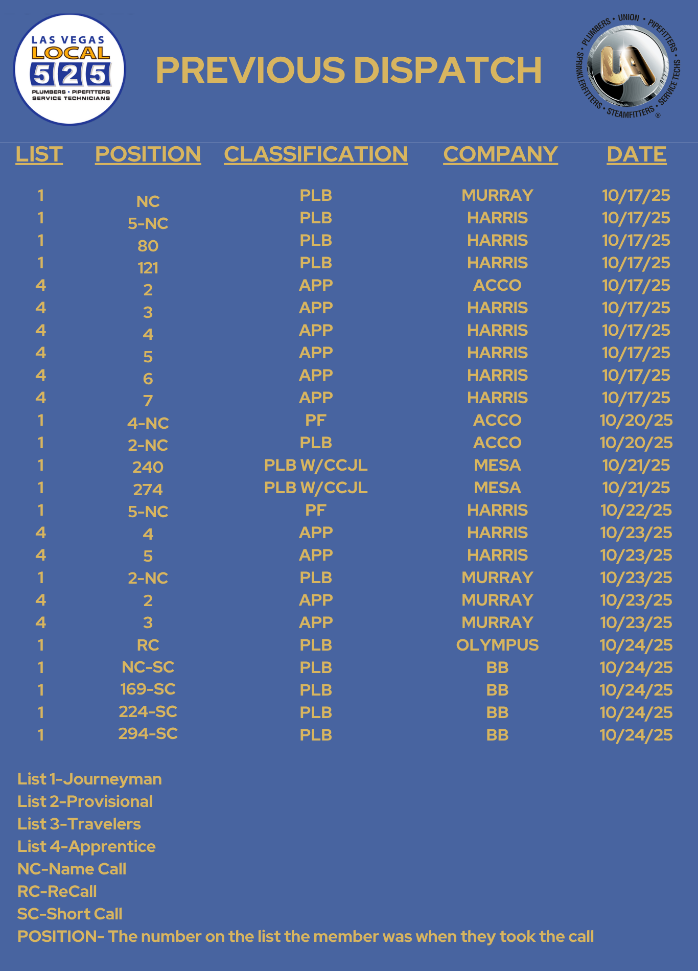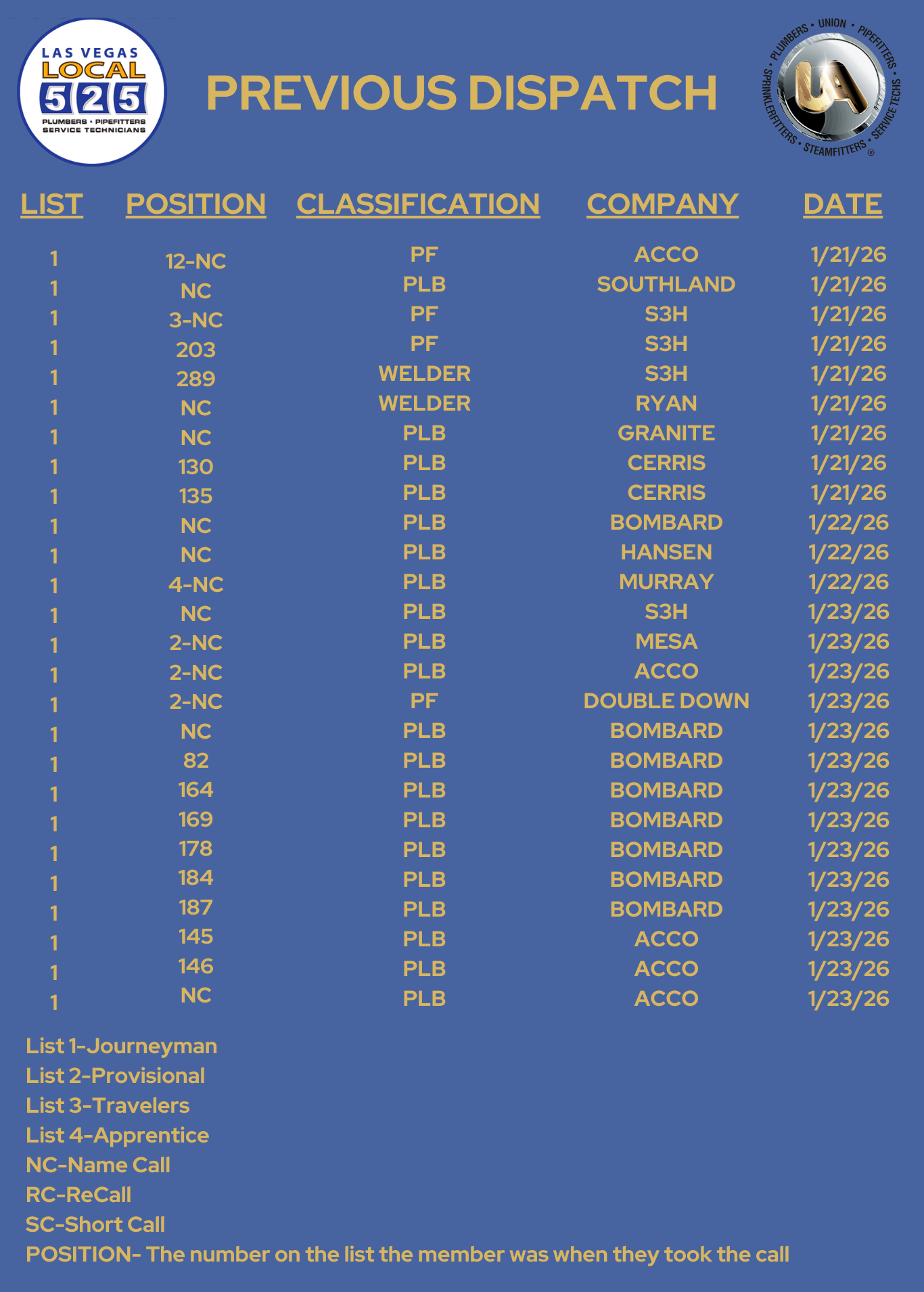 The dispatch call in phone is (702) 626-0817 – when you call this number you will be connected to Google Voice and asked to leave a message. PLEASE LEAVE A CLEAR MESSAGE STATING AND SPELLING YOUR FIRST AND LAST NAME. THE NUMBER YOU CALL IN FROM WILL BE THE NUMBER USED TO CALL YOU BACK - you can call to register once the job line is posted and until 9:15 am the day of dispatch - all calls will be recorded.